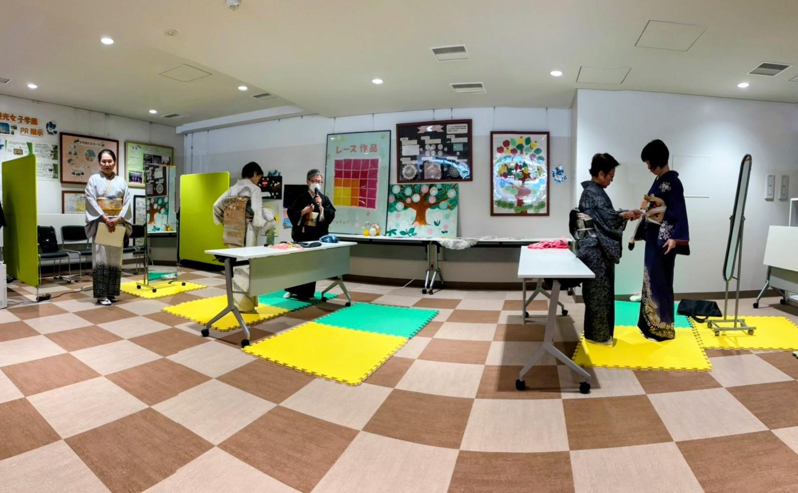 指導者たちは後見人を務め、着物に関する解説をし、変わり結びを披露し、オカリナの優しい音色で雰囲気を柔らかく盛り上げました。