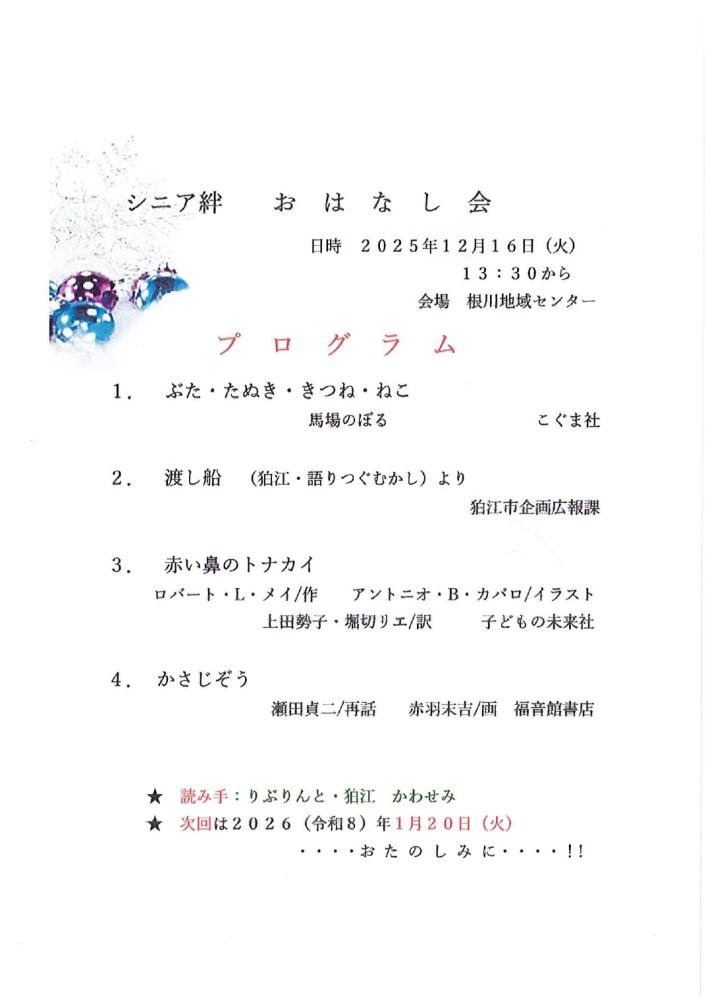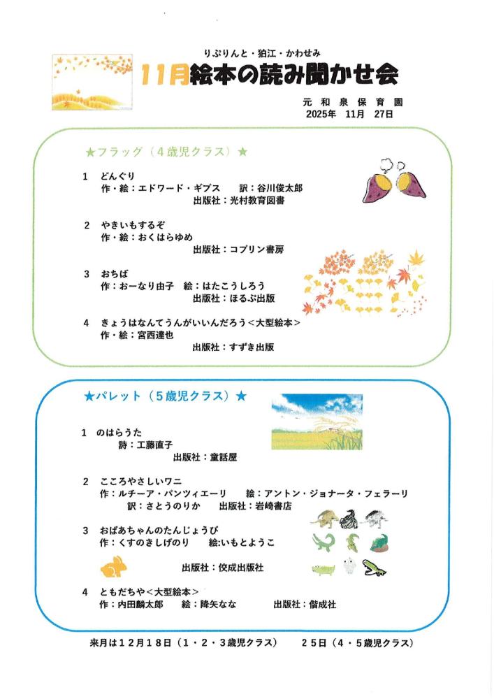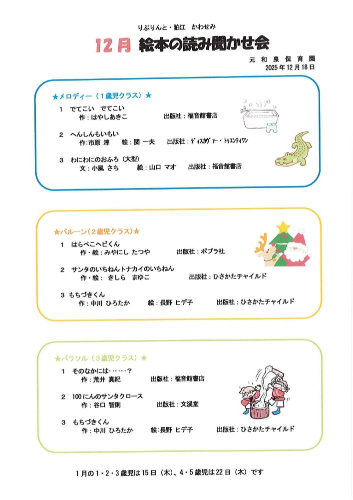 絵本を閉じると「私さる年なの・・・」と悲しそうに言うお客様が。えっ!と言葉に詰まる私達。気を取り直して、では次回はいいさるが出てくるお話をしましよう、と取りなして無事終了。