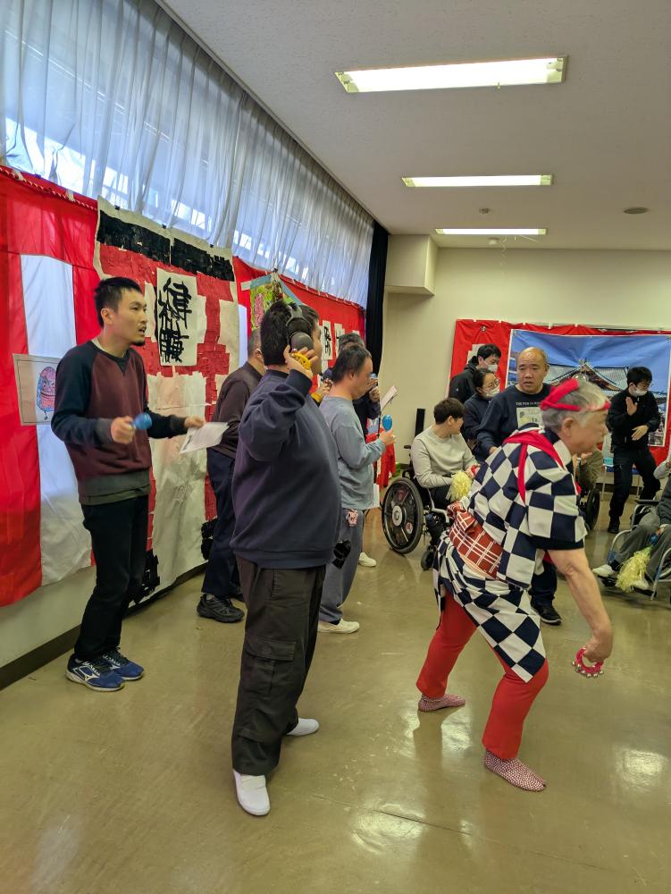 知的障害のある方の会の新年会に呼んで頂きました。ただ、皆さん自分の世界から出るのが難しいらしく、歌詞を見て一緒に歌うのは困難でした。歌声のほとんどは若いスタッフさん。それでも、体を揺らしてリズムをとる人、手をたたく人、それぞれ楽しんで頂けたのではないでしょうか。