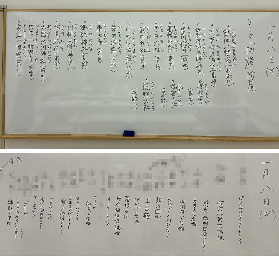 前半の指文字のテーマは、初詣にちなんで、有名神社とその所在地。