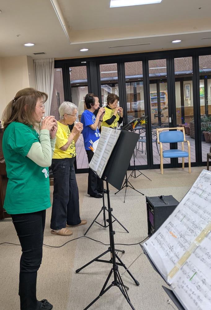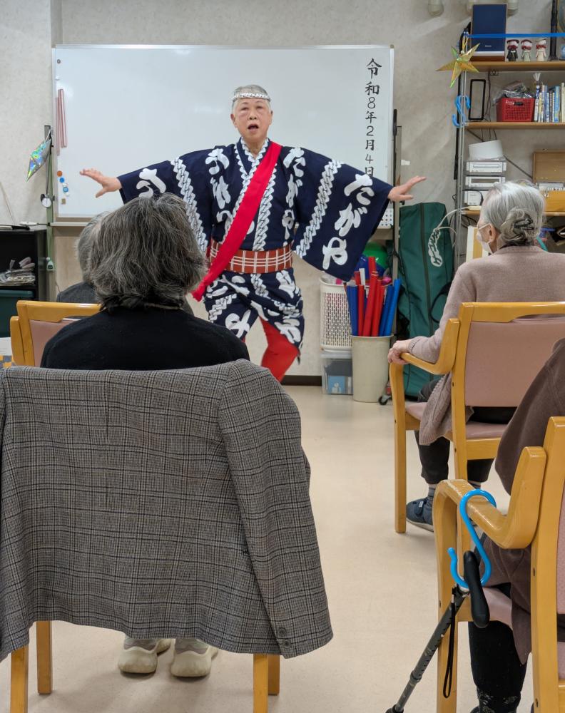 奴さん、深川などコミカルで粋な踊りを楽しみ、最後は陽気に、賑やかに「かっぽれ」で締めくくり、またきてね!の声に送られた。オカリナはみなさん歌が大好きなので、7曲すべて歌詞を配って熱唱。