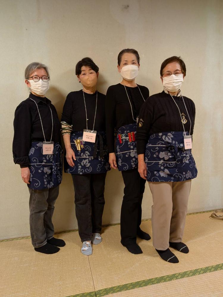 四季の会の早乙女さんが作ってくれた、お揃いの着付けエプロンを着用しました。おしゃれでしょう? -